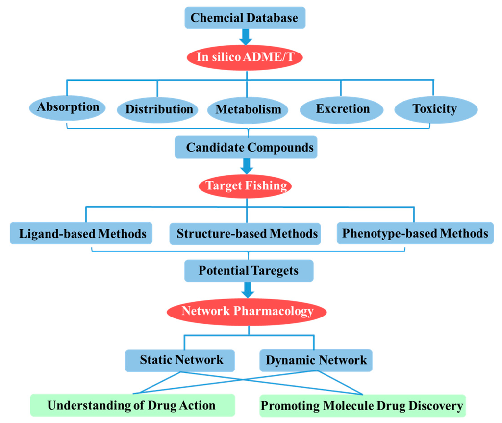 Therefore, in this review, we provide a holistic systems pharmacology strategy that integrated in silico ADME/T, target fishing and network pharmacology for the discovery of small molecular drugs at the system level (Figure 1). This comprehensive approach not only focuses on addressing disease mechanism, identification protein target and approaching drug discovery, but also aims at highlighting the invaluable role that system-based methods have played, and continue to play, in the drug discovery process and its future perspectives.