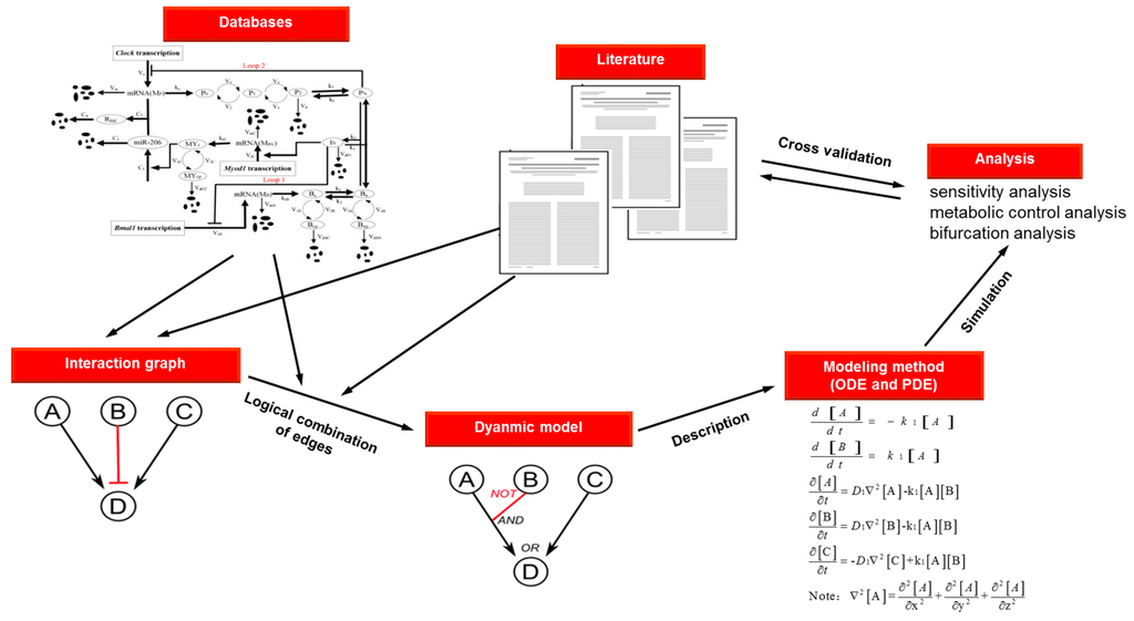 In general, dynamic network modeling is considered to be a series of chemical reactions, whose kinetics can be described by ordinary differential equation (ODE) and partial differential equation (PDE) to execute deterministic and stochastic simulations (Table 3). A system of ODEs is the most fundamental way to quantitatively simulate the dynamic response of each components in a network under different conditions [76], which can either be figured out exactly or by an approximate analytical method. The network modeled with deterministic ODEs can easily investigate steady states and the varieties of dynamic behavior with the state of system. Despite compartmental ODE modeling frequently used as a simplification for PDEs [77], sometimes detailed spatial localization is critical for cell signaling networks [78,79]. In this case, as reaction-diffusion equations in biochemical processes, PDEs can be used to explain diffusion and biochemical reactions of signaling markers in network. Under such situations, a stochastic model based on PDEs that allows for inherent fluctuations in dynamic network may give rise to qualitatively different behavior which differs significantly from those predicted by deterministic models. Different from the deterministic implementation, the stochastic simulation reactant equations were considered to interact as discrete entities. The explanation of random fluctuations which possibly affect reaction dynamics can be achieved [80]. The increased concern on the significance of signaling noise and the proliferation of single cell measurements proposed that stochastic models will be more accepted due to the potential availability and replicability of the variation of individual cell responses.