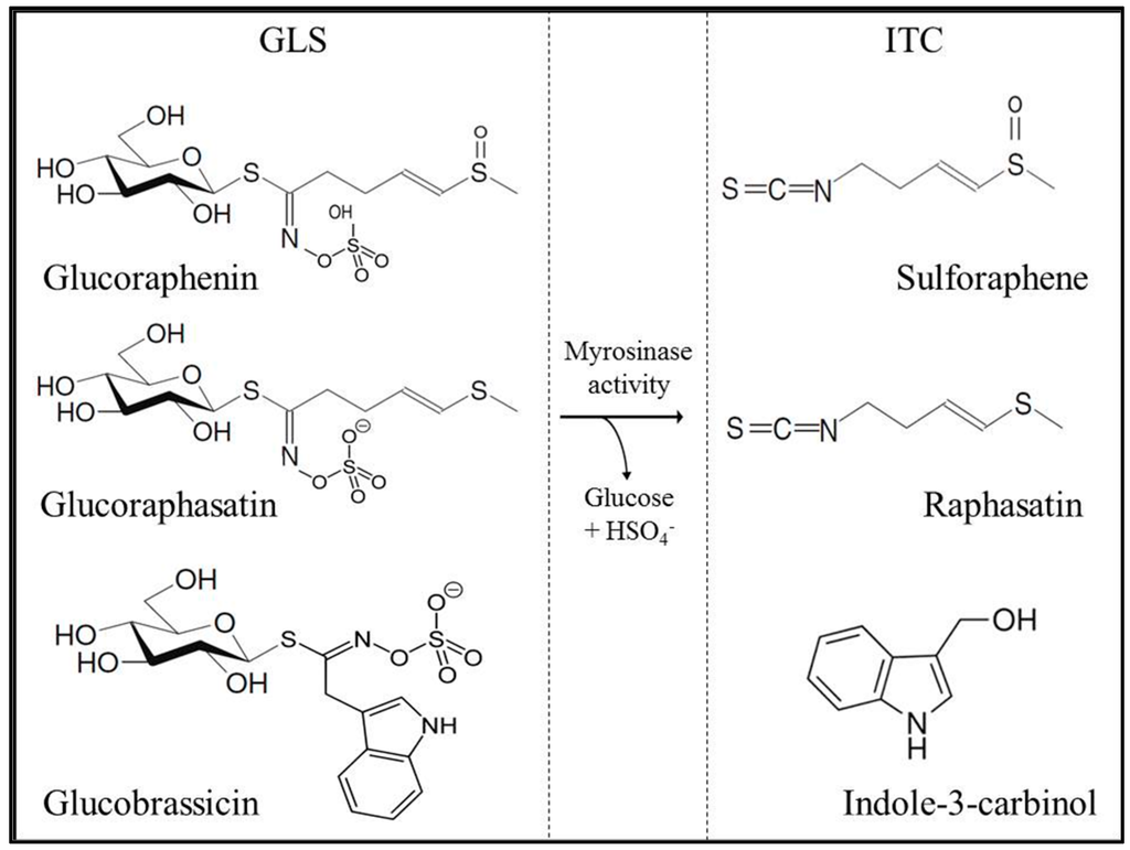 Glucosinolates in radish sprouts and their corresponding hydrolysis to isothiocyanates.