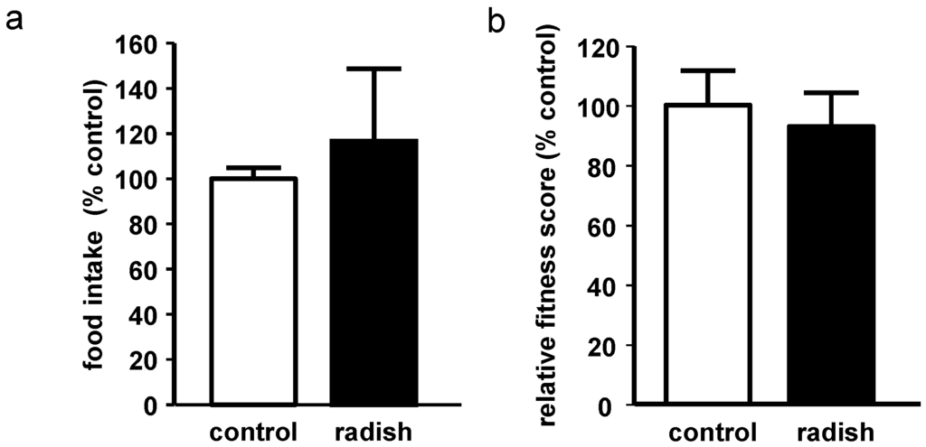 Effect of 10-day radish sprout supplementation on male Drosophila melanogaster. (a) relative food intake analyzed by the gustatory assay (n = 3 + SEM; extraction from 3 × 15 flies); (b) relative fitness score detected by the RING assay (n = 3 + SEM).