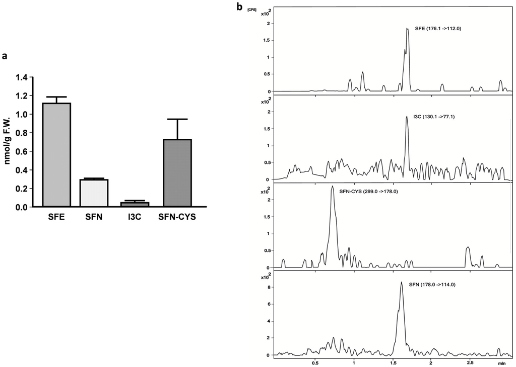 (a) Metabolites present in Drosophila melanogaster following the consumption of radish sprouts for 10 days; (b) Representative chromatogram of metabolites found in Drosophila melanogaster following the consumption of radish sprouts for 10 days. F.W. = fresh weight, SFE = sulforaphene, SFN = sulforaphane, I3C = indole-3-carbinole, SFN–CYS = sulforaphane–cysteine; n = 3 + SD.