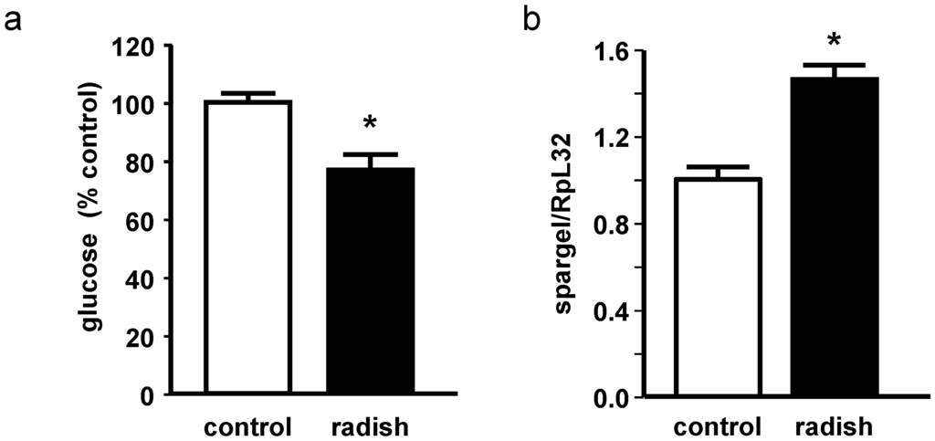 Effect of 10-day radish sprout supplementation on male Drosophila melanogaster. (a) relative glucose levels (n = 9 + SEM; extraction from 9 × 5 flies); (b) relative mRNA levels of spargel related to the housekeeping gene RpL32 (n = 3 + SEM; extraction from 3 × 5 flies). * indicates significant differences between control and radish sprout-fed flies (p < 0.05, Student’s t-test).