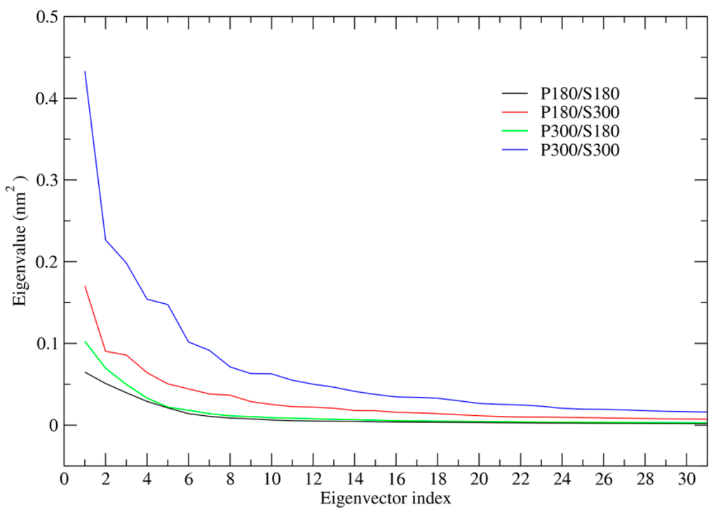 Figure 2 shows the eigenvalues as a function of eigenvector index. The four simulation systems share a common trend: the largest eigenvalue is for the first eigenvector and then the eigenvalues decrease with increased eigenvector index until they reach a minimum plateau. However, the degree of the steepness for these four eigenvalue curves is different and follows an order P300/S300 > P180/S300 > P300/S180 > P180/S180. Apparently, the first few eigenvectors of P300/S300 have the highest eigenvalues among those of the four combinations. The second highest, low, and the lowest eigenvalues of the first few eigenvectors are observed for the P180/S300, P300/S180 and P180/S180, respectively. These results indicate that the high solvent temperatures enhance greatly the anharmonic atomic motions and thus promote the global collective motions of the protein along the first few eigenvectors. In contrast, at the low solvent temperatures (i.e., P300/S180 and P180/S180), the first few eigenvectors have eigenvalues only slightly higher than those of eigenvectors with higher index, implying that the insignificant anharmonic atomic motions predominate along the first few eigenvectors, and as thus, the collective motions of the protein are greatly suppressed.