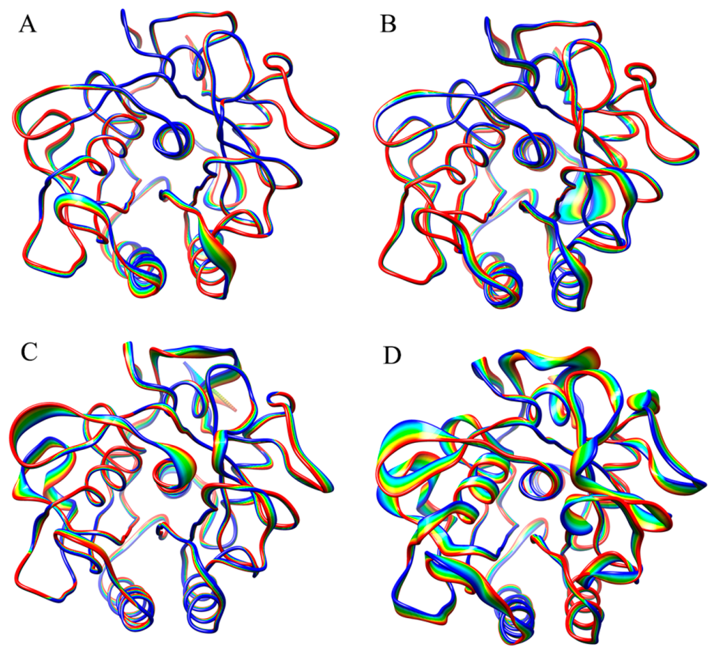 Figure 3 shows the projection extremes of the first eigenvector, which represent the most significant collective motions of proteinase K at each combined temperature. It should be noted that the linear interpolations between these two extremes are not the conformational transition pathway between the two extremes but emphasize merely the conformational differences between them. Under the P300/S300 combination (Figure 3D), proteinase K exhibits the most significant collective motions that involve conformational displacements over the entire structure, with the large and small displacements observed in the surface-exposed loops and SSEs, respectively. The second significant collective motions of proteinase K are observed for the P180/S300 combination (Figure 3C), which involve conformational displacements in most of the surface loops and some of the SSEs. Under the P300/S180 (Figure 3B) and P180/S180 (Figure 3A) combinations, most of the structural regions in the protein do not exhibit apparent displacements and only a very limited number of surface-exposed loops exhibit the large displacements. These observations are consistent with the eigenvalue order of the first eigenvector described above, both suggesting that the high solvent temperatures promote the global collective motions of the protein.