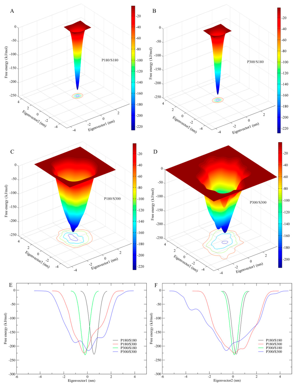 As shown in Figure 6A–D, all four FELs present a funnel-like shape. However, it is apparent that the FELs of the low solvent temperatures (P180/S180 and P300/S180) exhibit a perfectly smooth surface, whereas the surfaces of P180/S300 and P300/S300 feature a weak and strong rough character, respectively. This implies that the high solvent temperatures are able to produce local free energy minima either on the funnel wall or at the funnel bottom, thus increasing the protein conformational diversity or the number of conformational states/substates near the native state and hence the flexibility of the protein. The width of the FELs, from the bottom to the top outer surface, is found to be narrowest for P180/S180 and P300/S180, whereas for P180/S300 and P300/S300, the funnel width is obviously wide and the widest, respectively (Figure 6E,F). This reveals that the high solvent temperatures greatly increase the conformational entropy of the protein, whereas the protein temperatures have only minor effect on the protein conformational entropy. Another interesting result is that the FEL corresponding to the P300/S300 has a pronounced higher minimum free energy level than the other three FELs. Although the other three FELs have similar minimum free energy values, the value of the P180/S300 is slightly higher than those of P180/S180 and P300/S180. This suggests that proteinase K has lower thermostability (or structural stability) at the high solvent temperatures than at the low solvent temperatures.