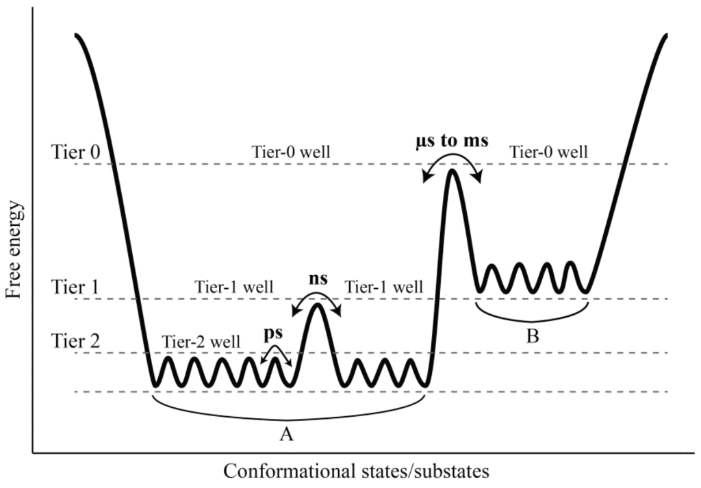 A proposed FEL model to explain the effect of the solvent mobility on protein dynamics. This model is represented as a hierarchical organization of free energy wells (i.e., the smallest tier-2 wells are within the relatively large tier-1 wells, and the tier-1 wells are within the largest tier-0 wells), which dictates the hierarchical dynamics of the protein (i.e., different structural components feature different amplitude and timescale of the fluctuations). The tier-2 and tier-1 substates and tier-0 states (A and B) are located within respective free energy wells. The tier-2, tier-1, and tier-0 dynamics, which are defined as conformational interconversion between respective substates/states, involve the side chain rotations on ps timescale, loop motions on ns timescale, and collective motions of the entire structure on timescale of μs to ms, respectively. The tire-0 dynamics are a result of the accumulation of the tier-1 and tier-2 dynamics. By exacerbating the competitive interactions between the protein and solvent and between atoms within the protein, the solvent mobility plays its role in facilitating the cascade amplification of microscopic motions of atoms and atomic groups into the global collective motions of the protein (for details, see the text).