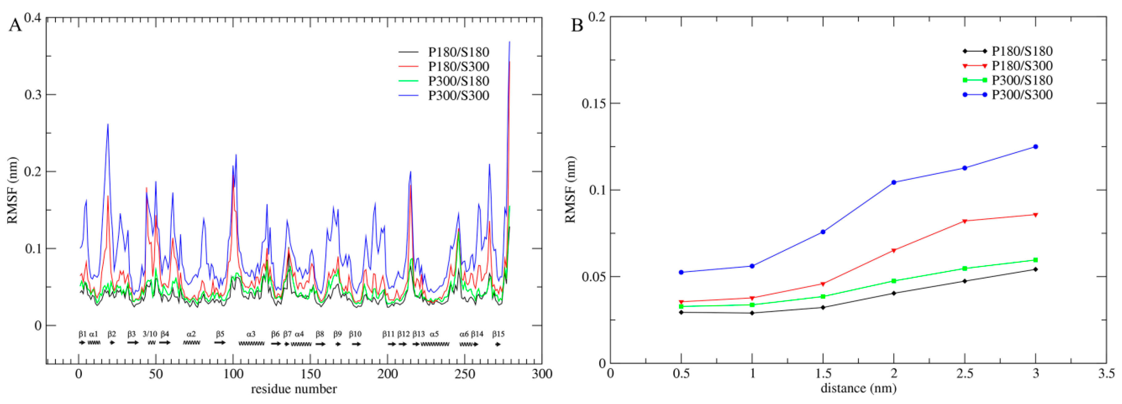 Figure 1B, whether at the protein surface or in the protein core, the RMSF values are in an order P300/S300 > P180/S300 > P300/S180 > P180/S180 and, for these four combinations, a consistent trend is observed: RMSF values increase with increased distance from the protein core to the surface. However, the degree of this increase is different, with the most dramatic increase observed for P300/S300, large increase for P180/S300, and small increase for P300/S180 and P180/S180, ultimately leading to the amplitudes of atomic fluctuations, which are distributed over the entire protein structure, in the order P300/S300 > P180/S300 > P300/S180 > P180/S180.