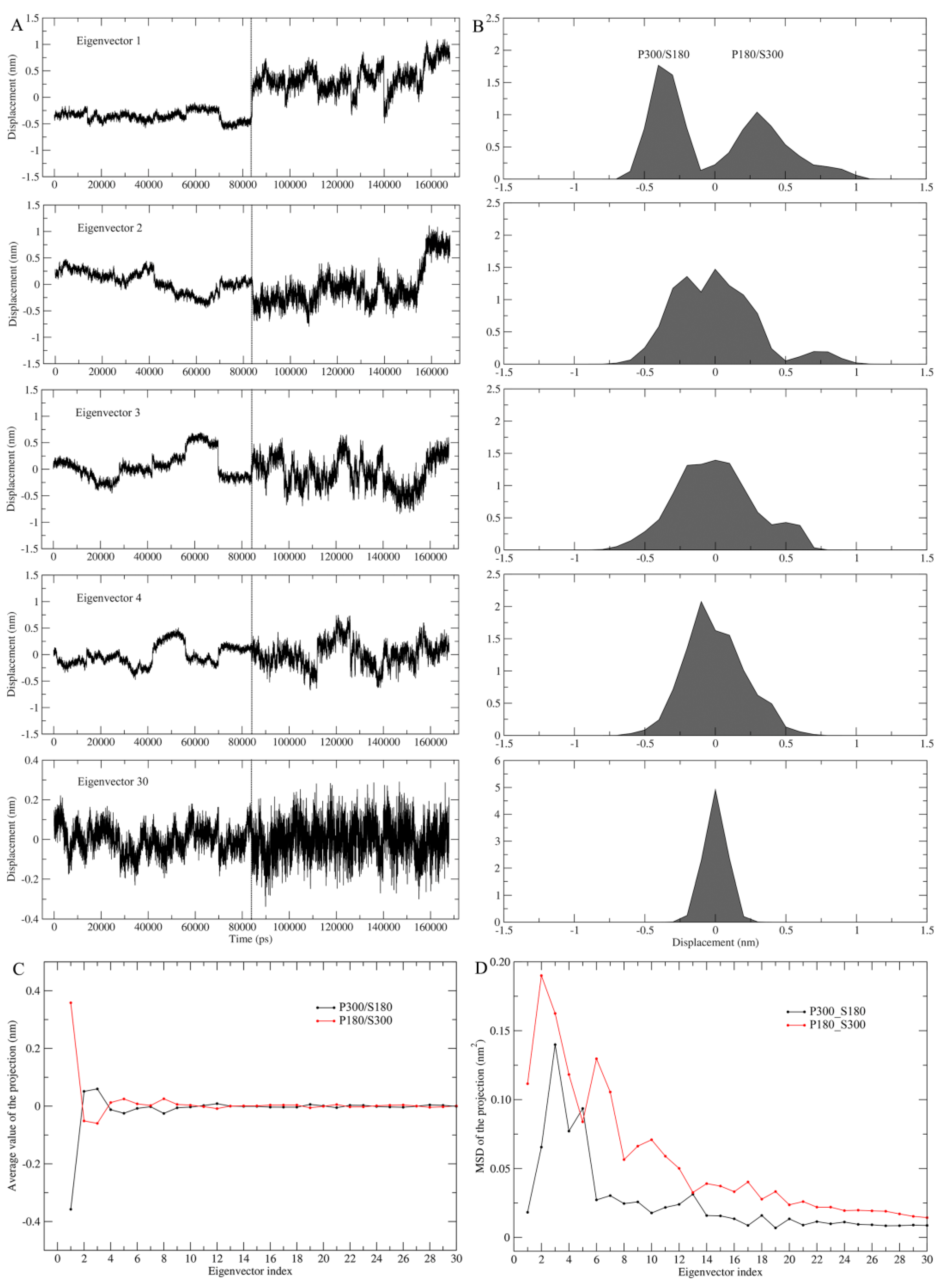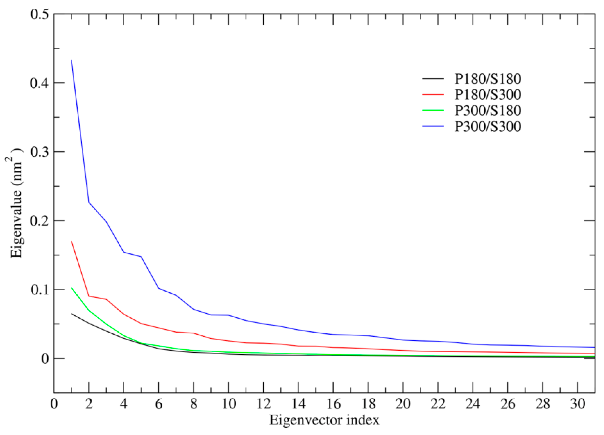 i.e., P300/S180 and P180/S180), the first few eigenvectors have eigenvalues only slightly higher than those of eigenvectors with higher index, implying that the insignificant anharmonic atomic motions predominate along the first few eigenvectors, and as thus, the collective motions of the protein are greatly suppressed.