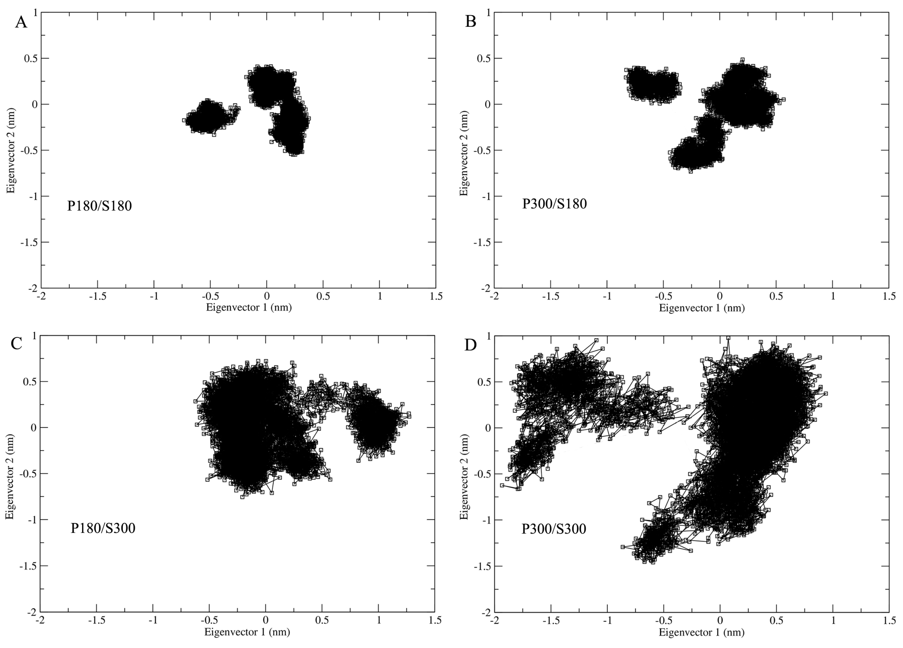 Figure 2 shows the eigenvalues as a function of eigenvector index. The four simulation systems share a common trend: the largest eigenvalue is for the first eigenvector and then the eigenvalues decrease with increased eigenvector index until they reach a minimum plateau. However, the degree of the steepness for these four eigenvalue curves is different and follows an order P300/S300 > P180/S300 > P300/S180 > P180/S180. Apparently, the first few eigenvectors of P300/S300 have the highest eigenvalues among those of the four combinations. The second highest, low, and the lowest eigenvalues of the first few eigenvectors are observed for the P180/S300, P300/S180 and P180/S180, respectively. These results indicate that the high solvent temperatures enhance greatly the anharmonic atomic motions and thus promote the global collective motions of the protein along the first few eigenvectors. In contrast, at the low solvent temperatures (