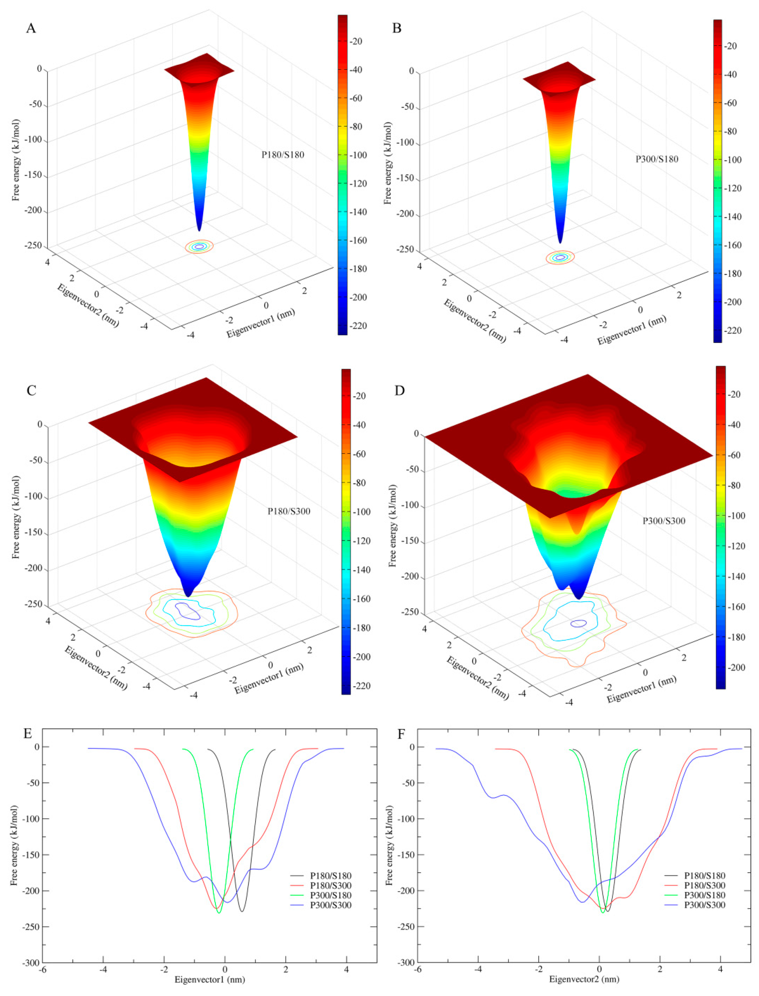 Figure 6E,F). This reveals that the high solvent temperatures greatly increase the conformational entropy of the protein, whereas the protein temperatures have only minor effect on the protein conformational entropy. Another interesting result is that the FEL corresponding to the P300/S300 has a pronounced higher minimum free energy level than the other three FELs. Although the other three FELs have similar minimum free energy values, the value of the P180/S300 is slightly higher than those of P180/S180 and P300/S180. This suggests that proteinase K has lower thermostability (or structural stability) at the high solvent temperatures than at the low solvent temperatures.