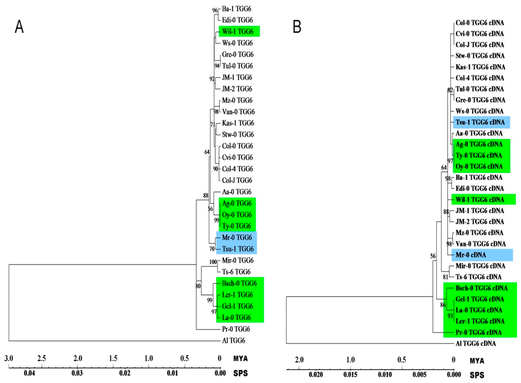 Fu, L.; Han, B.; Tan, D.; Wang, M.; Ding, M.; Zhang, J. Identification and Evolution of Functional Alleles of the Previously Described Pollen Specific Myrosinase Pseudogene AtTGG6 in Arabidopsis thaliana. Int. J. Mol. Sci. 2016, 17, 262. https://doi.org/10.3390/ijms17020262
