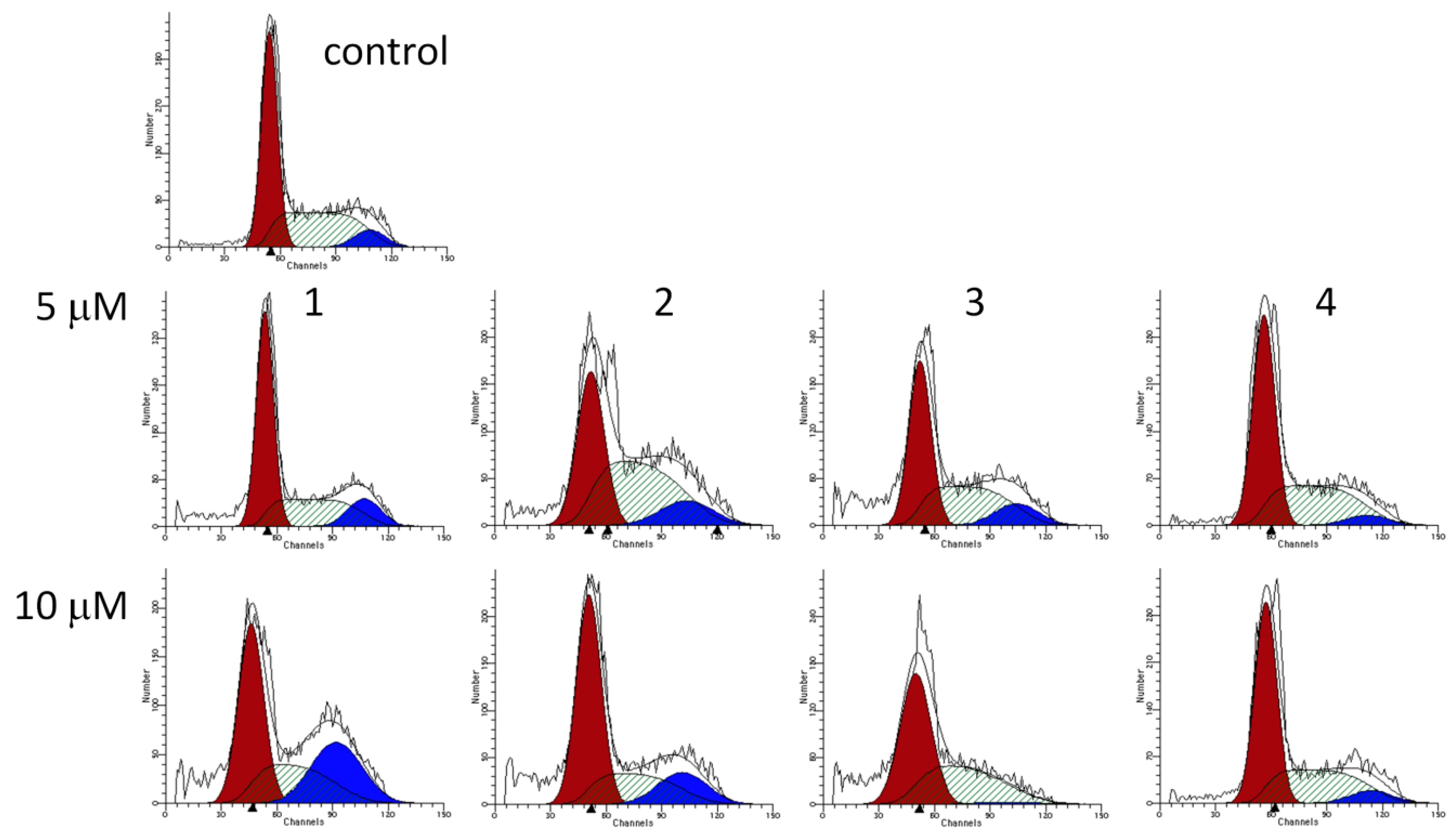 Representative cell-cycle histograms of control HL-60 cells after treatment with 5 or 10 µM 1–4 for 48 h.
