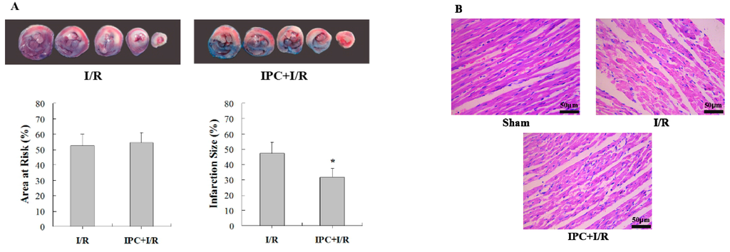 Rats were randomly assigned to one of three groups: sham-operation, I/R with IPC, and I/R without IPC. Myocardial I/R and the IPC procedure were performed as described in a previous study [41]. After rats were anesthetized by pentobarbital with no response to tail pinch, trachea intubation was performed and mechanical ventilation was established. A left thoracotomy was carried out, and a 6-0 silk suture was passed under the left anterior descending coronary artery (LAD) about 2 mm below the left auricle. Then, a slipknot was made around the LAD. An electrocardiogram (ECG) was recorded continuously. Occlusion of the LAD resulted in pallor heart color, reduced cardiac contraction, and ECG changes. Reperfusion was achieved by releasing the ligature and verified by the return of red color, improved cardiac contraction, and ECG recovery. Rats were subjected to 30 min of ischemia and 3 h of reperfusion. IPC was performed with three 5-min cycles of coronary occlusion and 5 min reperfusion. Sham-operated rats underwent the same surgical procedures except that the suture around the LAD was not ligated. Myocardial infarct size was detected by Evans blue-TTC double staining in the I/R and IPC+I/R groups (n = 6 per group). The myocardium at the ischemic area was collected from the three groups (sham-operation, I/R, and IPC+I/R; n = 6 per group) and divided into three parts: one for the terminal deoxynucleotidyl transferase-mediated dUTP nick end labeling (TUNEL) assay, hematoxylin and eosin (HE) staining, and immunohistochemical staining; one for western blot analysis; and another for PCR analysis.