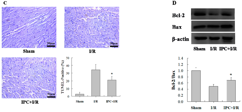 Ischemic preconditioning (IPC) treatment decreased myocardial ischemia/reperfusion (I/R) injury in vivo. (A) Representative photographs of Evans blue-TTC double staining and the quantitative analysis of myocardial infarct size between I/R (30-min ischemia/3-hour reperfusion) and IPC (three cycles of 5-min Ischemia/5-min Reperfusion)+I/R groups; (B) Hematoxylin and eosin (HE) staining of three groups, showing IPC mediated alleviation of the myocardium destruction; (C) Positive nuclear staining for myocardial apoptosis as assessed by the terminal deoxynucleotidyl transferase-mediated dUTP nick end labeling (TUNEL) assay and the quantitative analysis of apoptotic nuclei/total nuclei; (D) Analysis of Bcl-2 and Bax protein expression by western blotting and the corresponding quantitative analysis. β-actin was used as the loading control. n = 6. * p < 0.05 compared with I/R group.