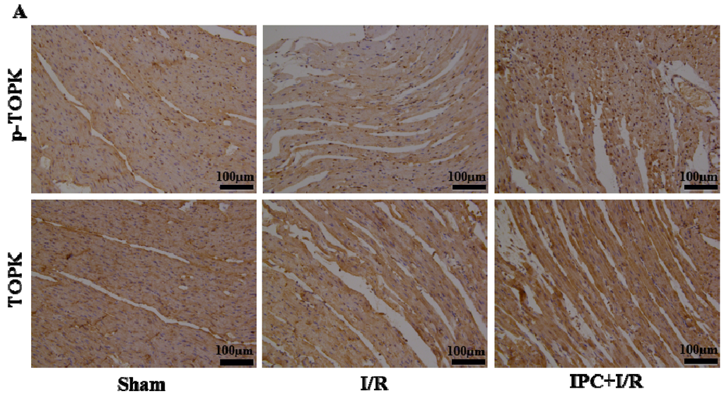 To explore the expression of TOPK in normal heart tissue and myocardium subjected to I/R injury and determine whether TOPK was significantly activated by IPC, we analyzed its expression in heart tissue following sham-operation, I/R, and IPC+I/R treatments by RT-PCR, western blotting, and immunohistochemistry (Figure 2). TOPK was observed to be significantly activated in the I/R and IPC+I/R groups, more so in the latter group. The active form p-TOPK, which was triggered by IPC and I/R, was mainly located in the nucleus. These results suggest that IPC induced protection against I/R injury, and this was accompanied by activation of the TOPK signaling pathway. Based on these results, we speculated that the activation of TOPK played a protective role against myocardial I/R injury.
