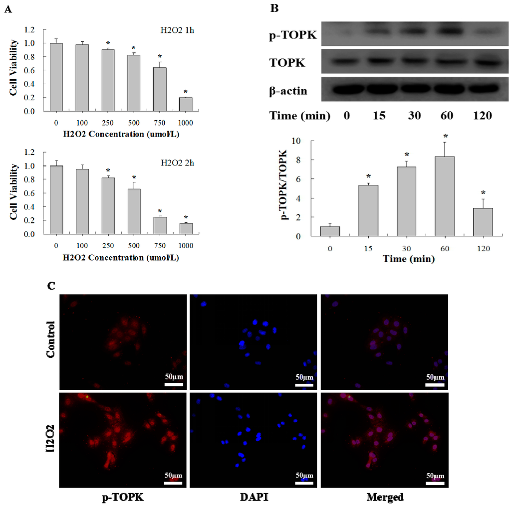 H2O2 treatment induced upregulation of p-TOPK in H9C2 cardiomyocytes. (A) Cultured H9C2 cardiomyocytes were stimulated with a different H2O2 concentrations (0–1000 µM) for various time points (1 or 2 h), and cell viability was evaluated by MTS assay; (B) Western blot analysis of TOPK activation by H2O2 treatment (750 µM for 0, 15, 30, 60, or 120 min); (C) Immunofluorescence staining of H9C2 cardiomyocytes with p-TOPK antibody (red) and DAPI for nuclei (blue) after treatment with 750 µM of H2O2 for 1 h. * p < 0.05 compared with nonstimulated controls.