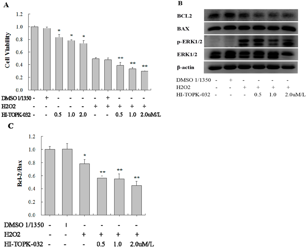 Analysis of the effects of the TOPK specific inhibitor HI-TOPK-032 on cell viability, apoptosis, and protein expression. H9C2 cardiomyocytes were incubated with HI-TOPK-032 at concentrations of 0.5, 1.0, and 2.0 µM for 24 h and then stimulated with 750 µM of H2O2 for 1 h. Dimethyl sulfoxide (DMSO) was used as a solvent control. (A) Cell viability as detected by MTS assay; (B) Western blot analysis of Bcl-2, Bax, ERK, and p-ERK expression. β-actin was used as a loading control; (C) The Bcl-2/Bax ratio was calculated and compared. * p < 0.05 compared with nonstimulated controls; ** p < 0.05 compared with H2O2-stimulated controls.