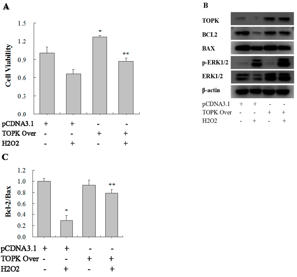 To further understand and validate the effect of TOPK in the injury of H9C2 cardiomyocytes, TOPK cDNA was overexpressed. After transfection with pCDNA3.1(+) (empty plasmid) or pCDNA3.1+TOPK, H9C2 cells were incubated with or without H2O2 (750 µM) for 1 h to induce oxidative stress injury. Later the cell viability of H9C2 cells was determined by MTS assay. As a result, TOPK overexpression increased both the basal cell viability and the cell viability following oxidative stress injury (Figure 5A). TOPK overexpression also increased the ratio of BCL-2/Bax, which was decreased by H2O2, and, at the same time, it increased ERK signaling activity, including the total level of ERK and ERK phosphorylation (Figure 5B,C).