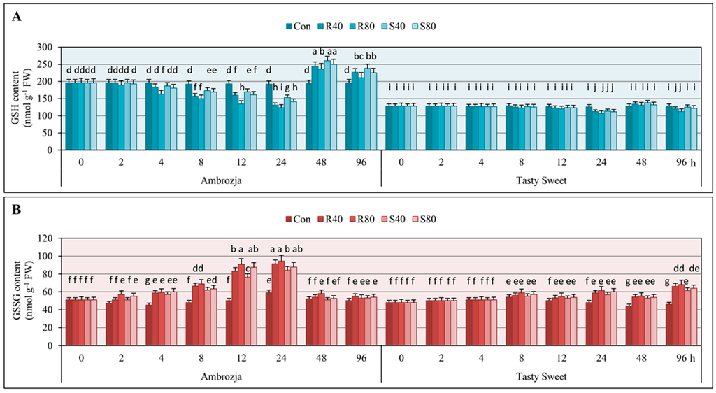 Figure 1. It was revealed a gradual increase in the level of oxidized glutathione from 2 hpi (5%–12%) to 24 hpi (65%–85%) in Ambrozja plants, and from 8 hpi (2%–10%) to 24 hpi (18%–28%) in tissues of Tasty Sweet cultivar. At 48 hpi, lower increments in GSSG level were recorded (1%–8% and 10%–15% in Ambrozja and Tasty Sweet seedlings, respectively). Importantly, prolonged aphid feeding (96 hpi) was linked to strong elevation (26%–42%) in GSSG content in Tasty Sweet plants, and only minor increments in the quantified compound (4%–11%) were detected in seedlings of Ambrozja genotype. Moreover,