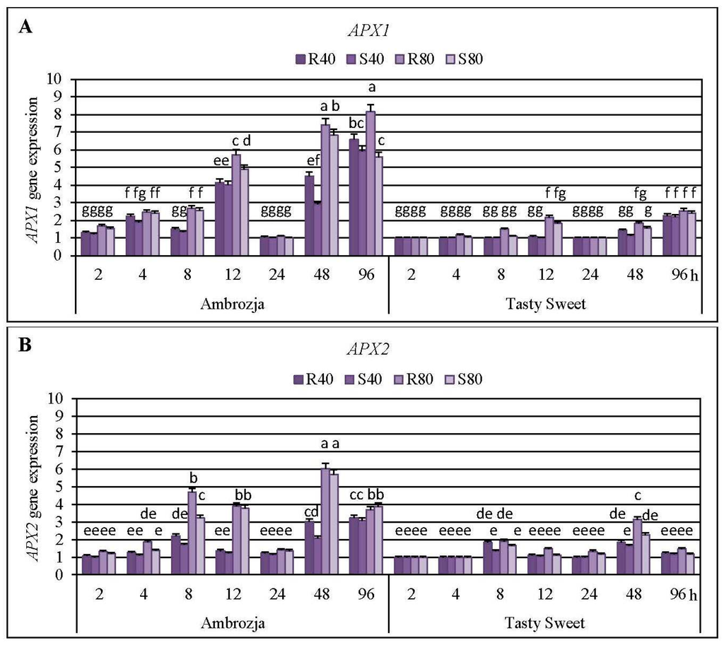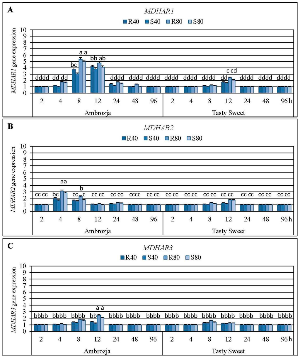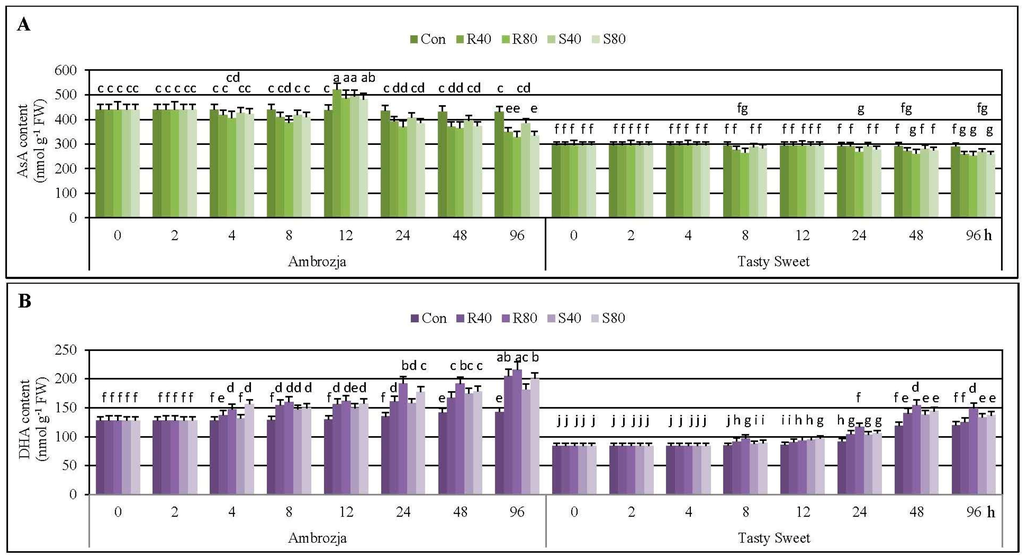 Time-course analysis evidenced circumstantial declines in AsA/DHA ratios in aphid-stressed Ambrozja and Tasty Sweet plants (2%–50%, and 4%–32% decrements, respectively) (