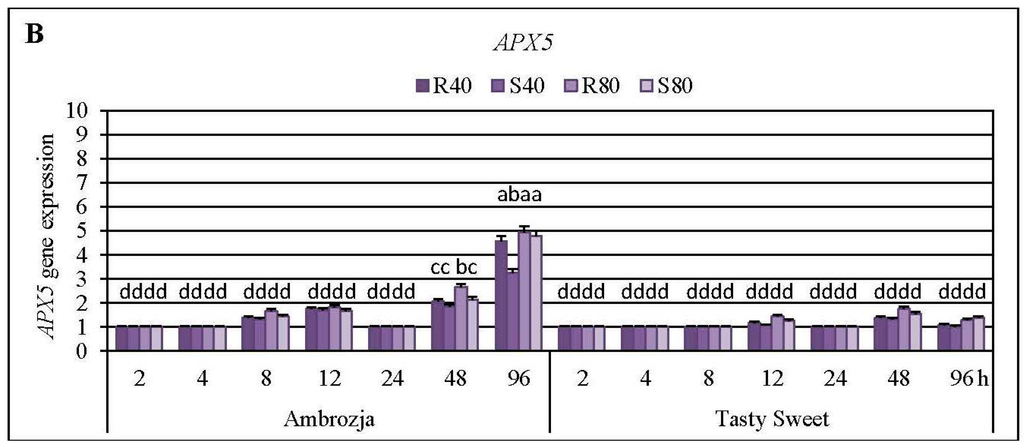 Supplementary Material, Figure S6). The highest increments in expression of the target gene were noted after 48 hpi in Ambrozja and Waza varieties (236%–308% and 294%–420% increases, correspondingly), whereas the lowest increases were observed in