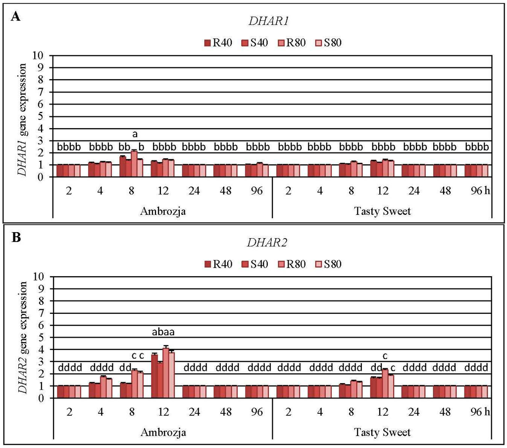DHAR1 gene (at 5 hpi, 5.1- and 4.5-fold increases, respectively), compared to the unstressed control. Importantly,