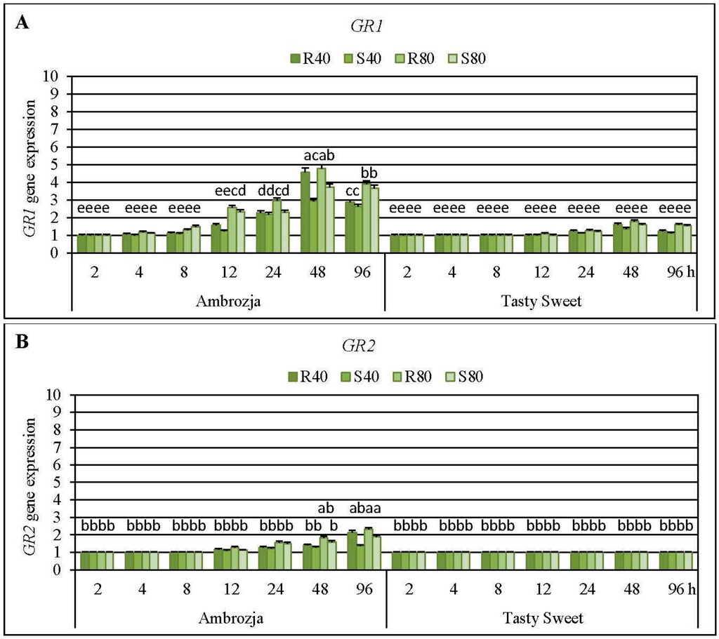 GR1 mRNA in Ambrozja and Tasty Sweet varieties, accordingly, compared to changes evoked by the equal number of the grain aphid females). The only exception was the expression of