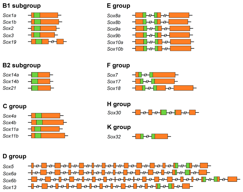 Exon–intron structure of the tilapia Sox genes. Rectangle and line with double slash indicate exon and intron, respectively. The HMG-box domain regions and the rest regions of the exons are highlighted with green and brown, respectively.