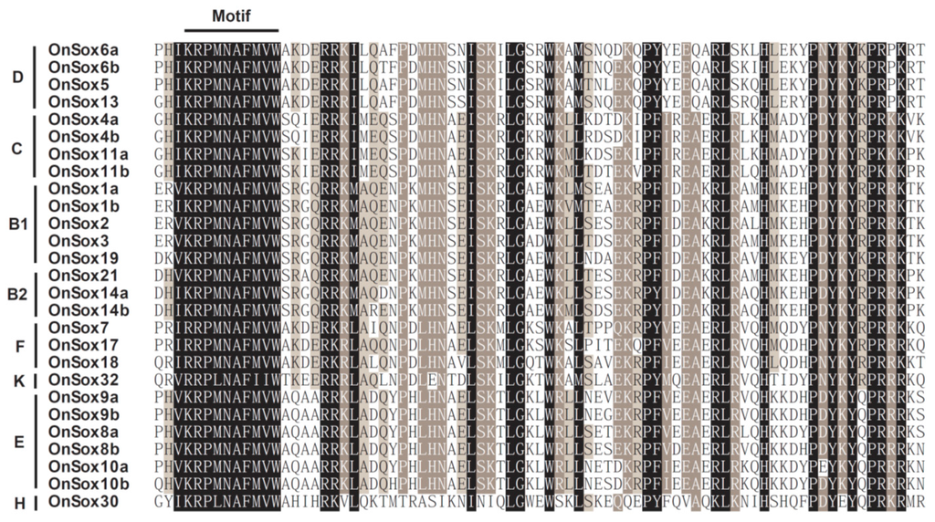 The amino acid sequences of the HMG boxes of the tilapia Sox proteins were aligned. As shown in Figure 2, the core motif of RPMNAFMVW (in the position of 5–13) in the HMG boxes of the tilapia Sox proteins, which is responsible for recognizing and binding cis-regulatory elements in the promoter of their target genes, is highly conserved. Especially, these motifs are the same among the tilapia Sox proteins, except for Sox30 and Sox32.