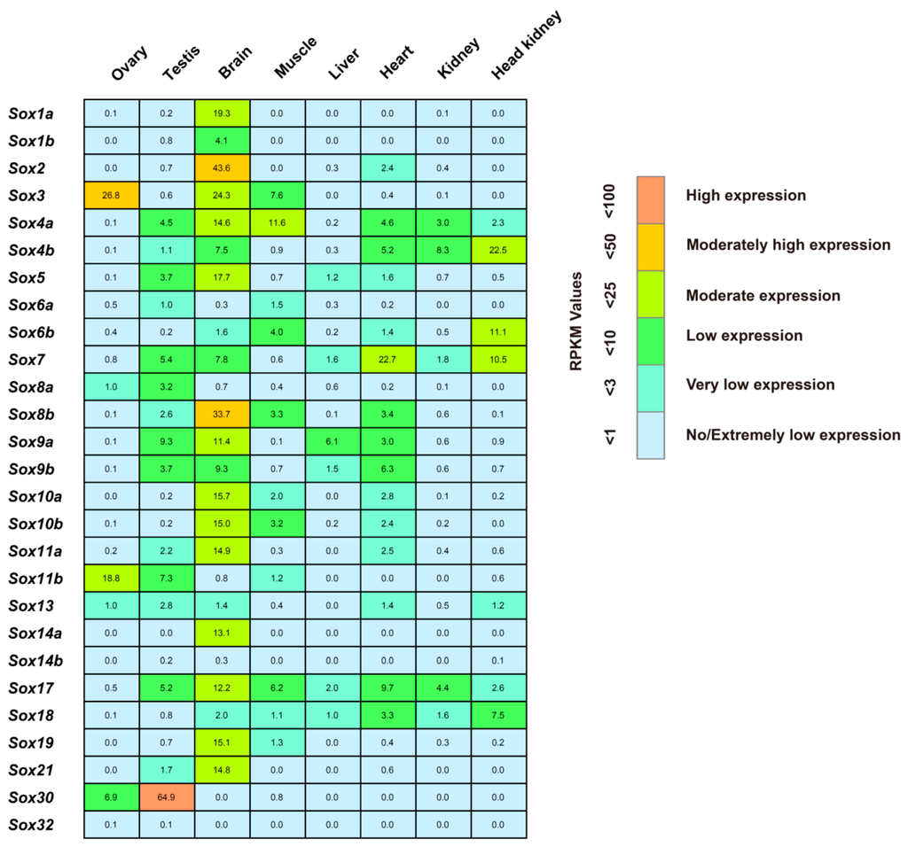 Notably, four Sox genes showed high expression with RPKM value ≥25, including Sox3 in ovary, and Sox30 in testis, and Sox2 and Sox8b in brain (Figure 4). Moreover, 16 Sox genes were moderately expressed in different adult tissues, showing RPKM value that were greater than 10 and less than 25, including Sox11b in ovary, Sox1a, Sox3, Sox4a, Sox5, Sox9a, Sox10a, Sox10b, Sox11a, Sox14a, Sox17, Sox19, and Sox21 in brain, Sox4a in muscle, Sox7 in heart, and Sox4b, Sox6b, and Sox7 in head kidney. Interestingly, several Sox genes showed a tissue-specific expression, including Sox8a in ovary, and Sox1a, Sox1b, Sox2, Sox14a, Sox19, and Sox21 in brain.