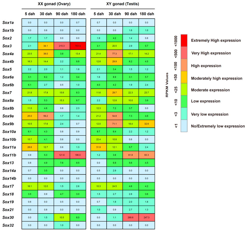 A normalized measure of RPKM value was used to characterize the expressions of the tilapia Sox genes. A threshold of RPKM value ≥ 1 was used to determine a reasonable expression for each Sox gene in a specific tissue at a specific time points [66,67]. The method described in our previous report was used to identify Sox genes sexually dimorphically expressed in gonads (XX or XY gonads) at each developmental stage [42]. Briefly, at each stage, Sox genes that were expressed specifically either in the XX or XY gonad only were classified as XX or XY-specific, whereas among the Sox genes expressed in both XX and XY gonads, those meeting the statistical criteria of both “FDR ≤ 10−2” and “|log2 (XX_RPKM/ XY_RPKM)| ≥ 1 or ≤ −1” were classified as differentially expressed candidates.