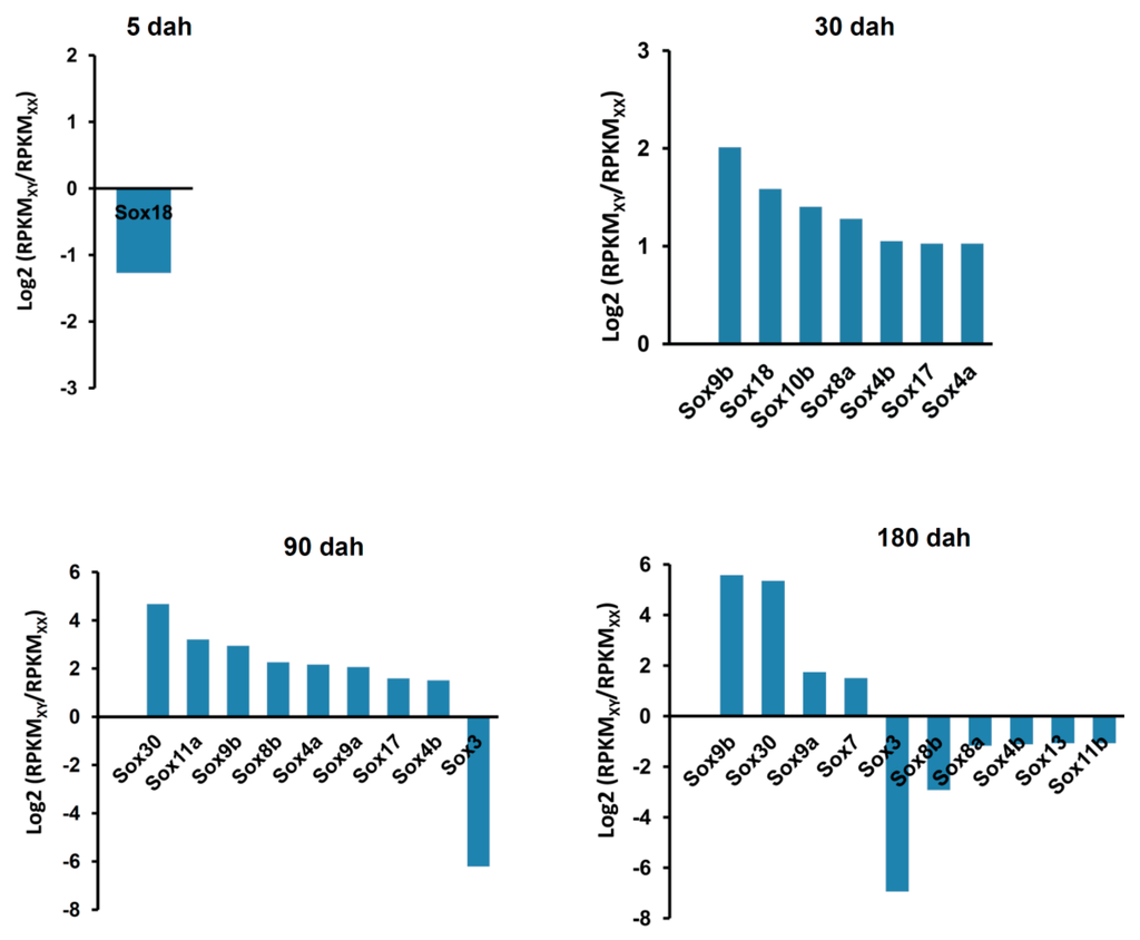 Second, we observed there were 1, 7, 10, and 10 Sox genes to display sexually dimorphic expression at 5 dah, 30 dah, 90 dah, and 180 dah, respectively (Figure 5 and Figure 6). In detail, only Sox18 was up-regulated in XX gonads (ovary) at 5 dah. At 30 dah, seven Sox genes, containing Sox4a, Sox4b, Sox8a, Sox9b, Sox10b, Sox17, and Sox18, were up-regulated in XY gonads (testis). In addition, we noted that eight Sox genes (i.e., Sox4a, Sox4b, Sox8b, Sox9a, Sox9b, Sox11a, Sox17, and Sox30) and four Sox genes (i.e., Sox7, Sox9a, Sox9b, and Sox30) were up-regulated in XY gonads (testis) at 90 and 180 dah, respectively. Conversely, several Sox genes showed up-regulation in XX gonads (ovary), including Sox3 at 90 dah and 6 Sox genes (i.e., Sox3, Sox4b, Sox8a, Sox8b, Sox11b, and Sox13) at 180 dah. Intriguingly, although Sox9a was highly expressed in both XX (ovary) and XY (testis) gonads at 5 and 30 dah (Figure 5 and Figure 6), it began to be differentially expressed in gonads, showing an up-regulation in XY gonads (testis) at 90 and 180 dah. Besides, Sox9b expression exhibited a significant up-regulation in XY gonads (testis) at 30, 90 and 180 dah. Consistently, quantitative RT-PCR examination revealed similar developmental and sexually dimorphic expressions of Sox9a and Sox9b in the tilapia gonads, and further confirmed that compared to XY gonads (testis), the expression of the Sox9a gene displayed a significant up-regulation in XX gonads (ovary) at 5 and 10 dah.