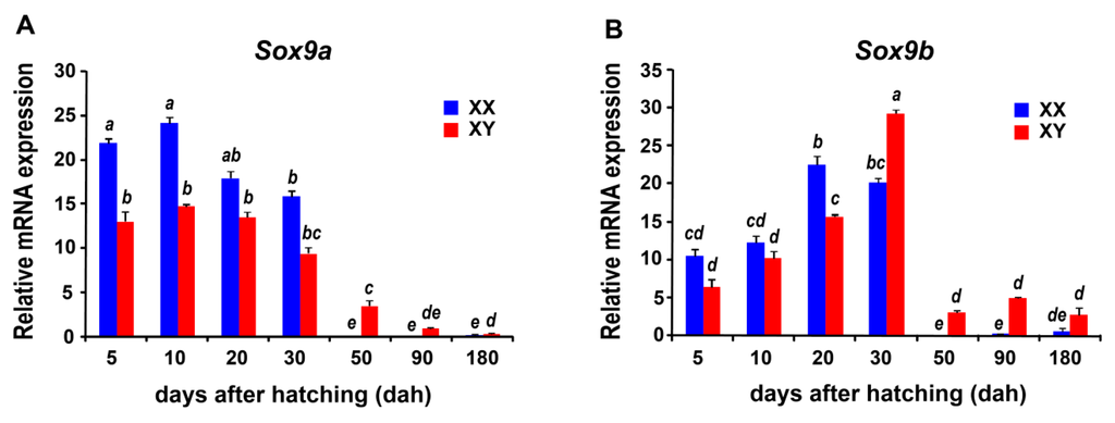 We used transcriptome data of the tilapia XX (ovary) and XY (testis) gonads at four developmental stages, namely 5, 30, 90 and 180 days after hatching (dah), to profile the temporal expression of the tilapia Sox genes. The results revealed that except for Sox1a, the other 26 Sox genes were expressed in XX (ovary) and/or XY (testis) gonads in at least one development stage (Figure 5). Among these expressed Sox genes, nine members (i.e., Sox3, Sox4a, Sox4b, Sox7, Sox9a, Sox9b, Sox11a, Sox11b, and Sox30) and four members (i.e., Sox8a, Sox8b, Sox10b, and Sox17) presented high expression and a moderate expression in XX (ovary) and/or XY (testis) gonads in at least one developmental stage, respectively.