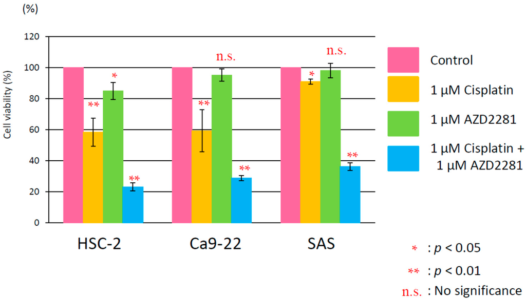 To investigate the cytotoxic effects of AZD2281 on three cell lines (HSC-2, Ca9-22, and SAS) derived from oral squamous cell carcinoma, we performed 3-(4,5-dimethyl-2-thiazolyl)-2,5-diphenyltetrazolium bromide (MTT) assays. The half maximal inhibitory concentration (IC50) of AZD2281 for HSC-2, Ca9-22 and SAS cells after 24 h of treatment was estimated to be 7.2, 15, and >20 µM, respectively (Figure S1). Next, synergetic effects of AZD2281 and cisplatin were assessed based on the results of MTT assays. Cell viability was significantly reduced by cisplatin treatment in a dose-dependent manner. The IC50 of cisplatin was 4.8 µM in HSC-2 cells, 9.1 µM in Ca9-22 cells, and 16.0 µM in SAS cells. With addition of 1 µM AZD2281, the IC50 of cisplatin was 2.4, 4.4, and 8.8 µM in HSC-2, Ca9-22, SAS cells, respectively (Figure S2A–C). The combination index (CI) of each cell line of 50% was 0.524 for HSC-2 cells, 0.549 for Ca9-22 cells, and 0.596 for SAS cells. Each CI was less than 1.0, indicating that AZD2281 had synergetic effects with cisplatin.