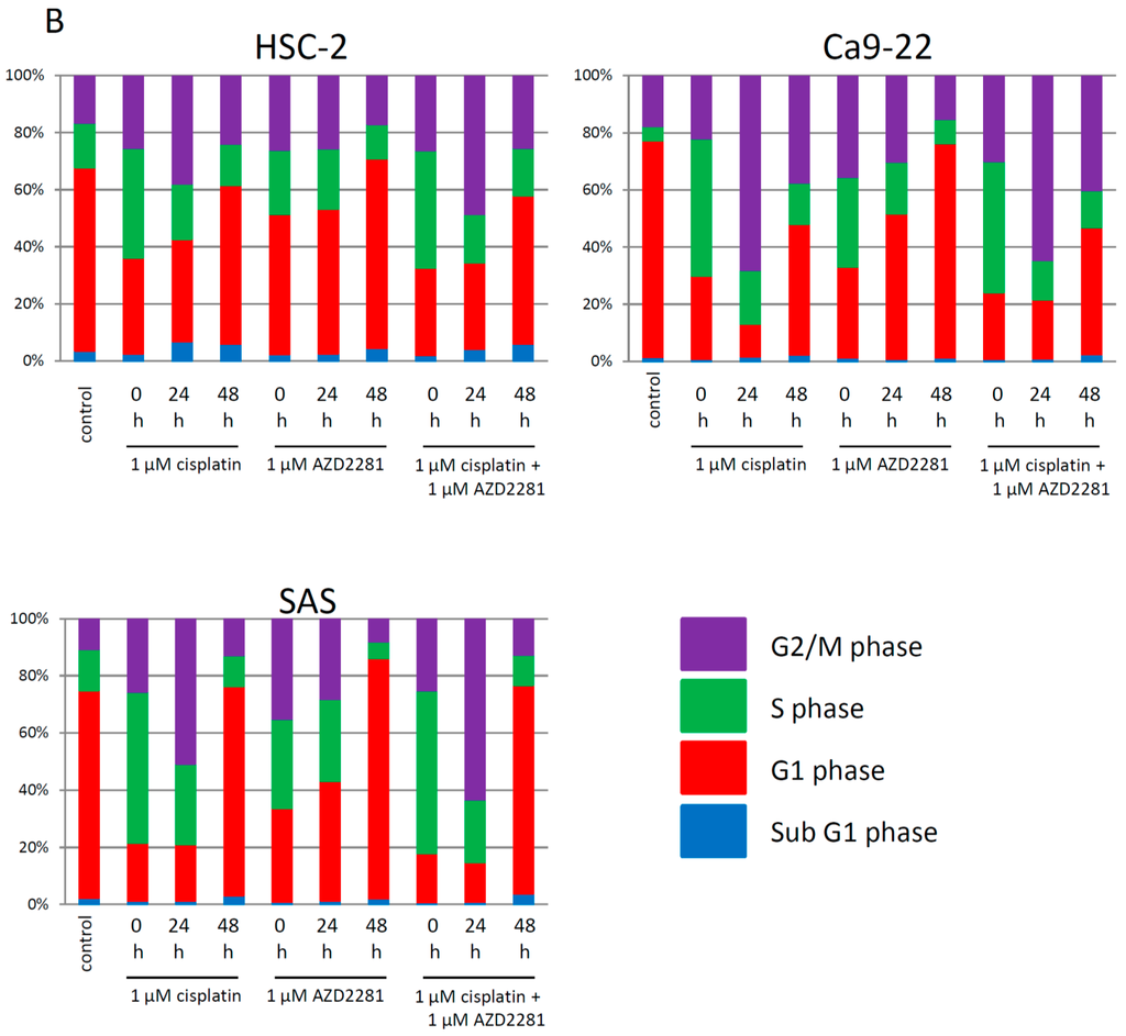 In cell cycle analysis, cells were treated with 1 µM cisplatin, 1 µM AZD2281 and their combination for 18 h and allowed to grow for 0, 24, and 48 h and analyzed. At 0 h analysis, G2/M arrest was observed in the cisplatin and the combination group of HSC-2 and SAS cell lines, and both G2/M and S phase arrest was observed in the cisplatin and the combination group of Ca9-22 cell line. Twenty-four hour after incubation, G2/M arrest was still observed in the same administration group in all cell lines, and each cell cycle was almost recovered after 48 h incubation. In all cell lines, 1 µM AZD2281 showed slight effects on cell cycle and after 24 h incubation, the cell cycle was almost recovered in all cell lines (Figure 2A). The population of G1 phase in the control group was 63.95%, 75.75%, and 72.51% in HSC-2, Ca9-22, and SAS cell lines, respectively. After cisplatin and combination drug administration, each G1 population was dramatically decreased, and recovered after 24 and 48 h incubabation. The population of sub G1 was relatively high in HSC-2 cell lines (3.53% in control group) compared to another two cell lines (Figure 2B).