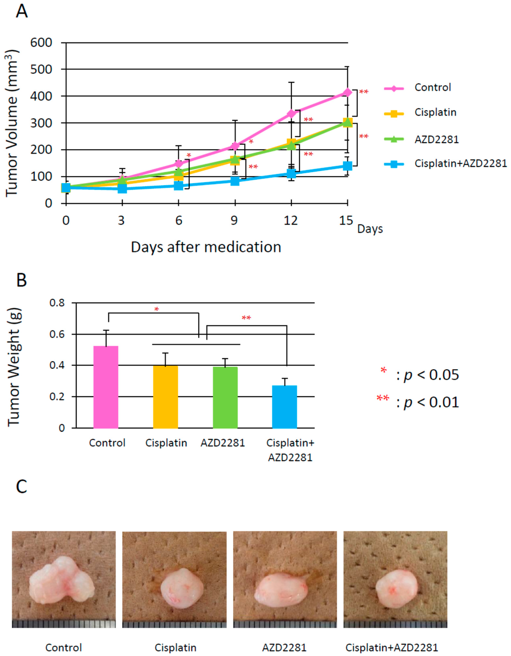 (A) Increases in tumor volumes during treatment with cisplatin or AZD2281, or combinatorial treatment with both cisplatin and AZD2281; (B) tumor weights just after sacrifice in the control, cisplatin, AZD2281, and combination groups; and (C) photos of representative tumors in the control, cisplatin, AZD2281, and combination treatment groups. Values are expressed as the mean ± SEM. * p < 0.05; ** p < 0.01.