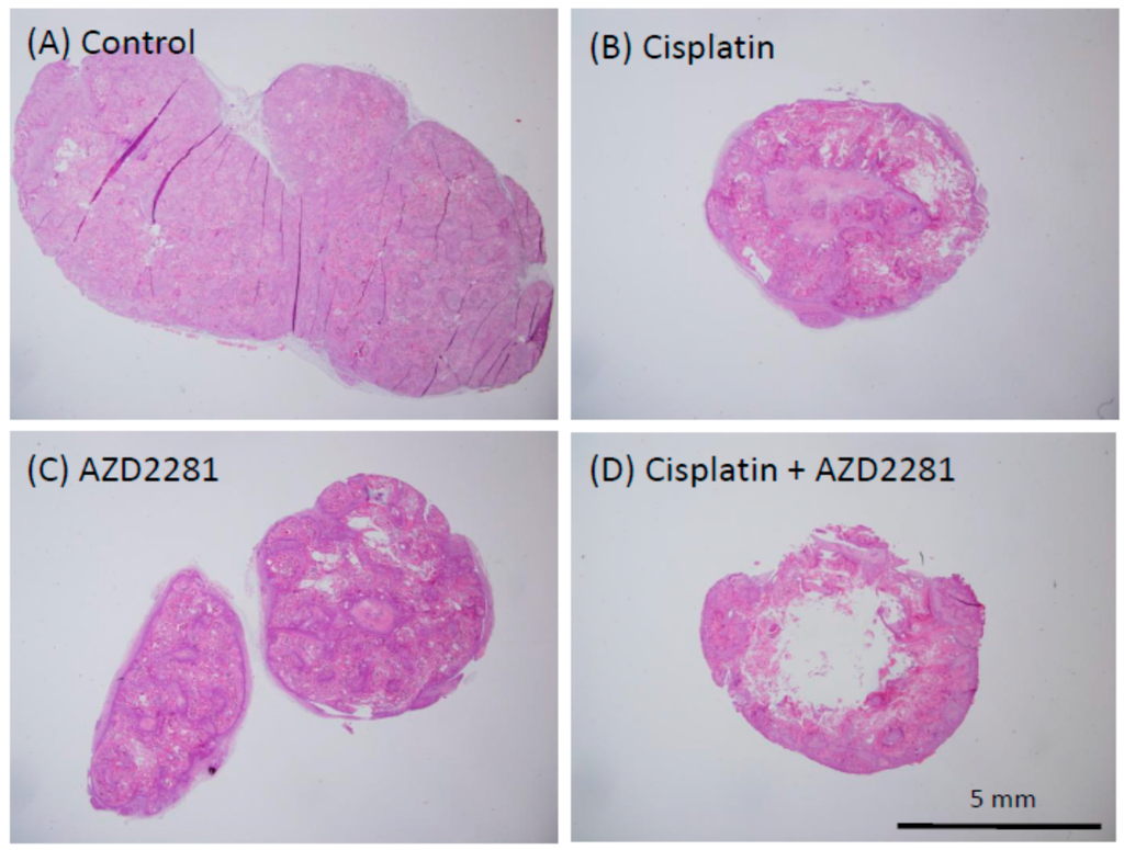 Histopathological analysis of representative xenografted tumors in control (A); cisplatin (B); AZD2281 (C); and combination treatment (D) groups. Scale bar, 5 mm.