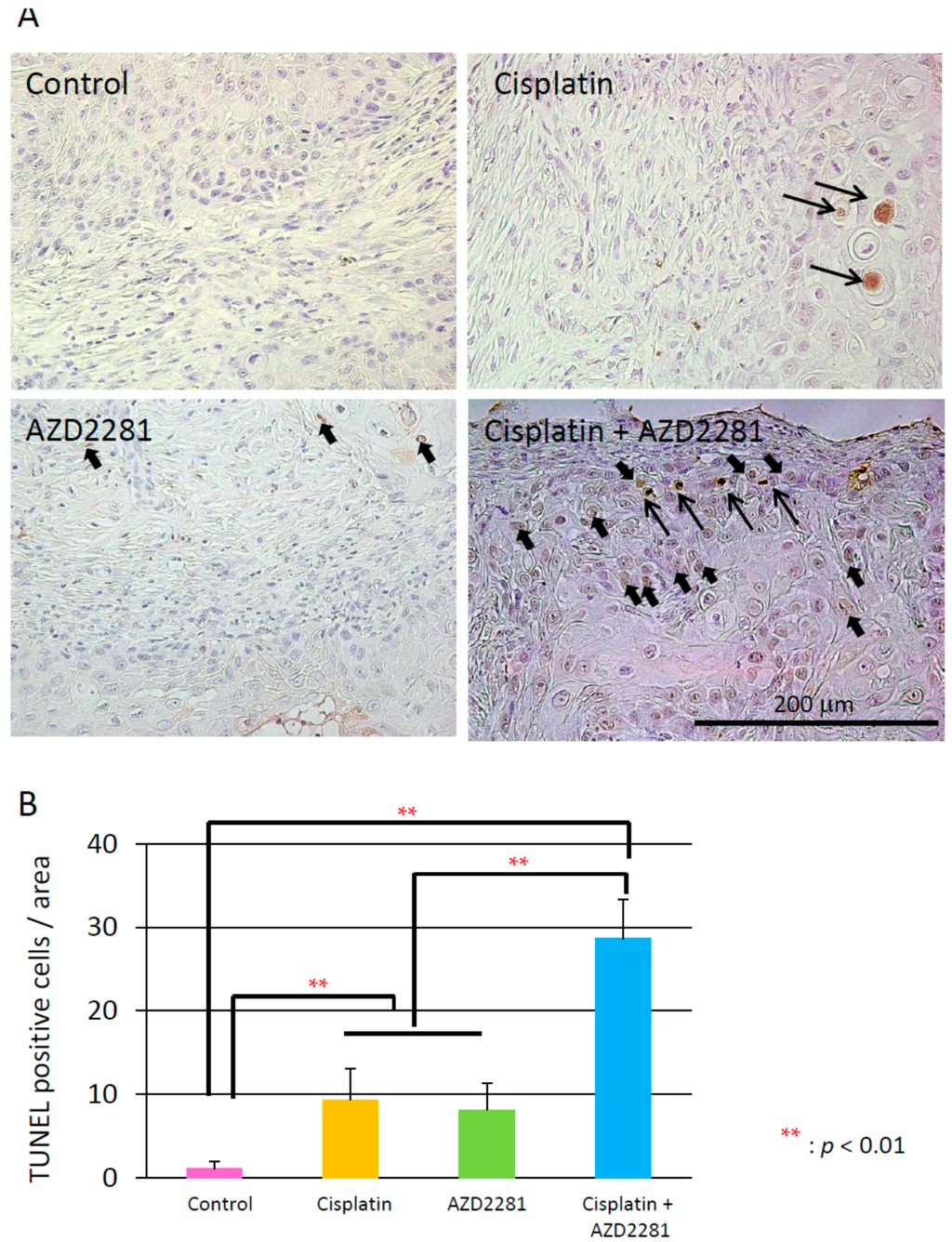 (A) TUNEL staining of xenografted tumors in control (upper left); cisplatin (upper right); AZD2281 (lower left); and combination (lower right) groups. Open arrows indicate apoptotic cells, and closed arrows indicate pre-apoptotic cells. Scale bar, 200 µm; (B) TUNEL-positive cells (both apoptotic and pre-apoptotic cells) per area in each treatment group. ** p < 0.01.