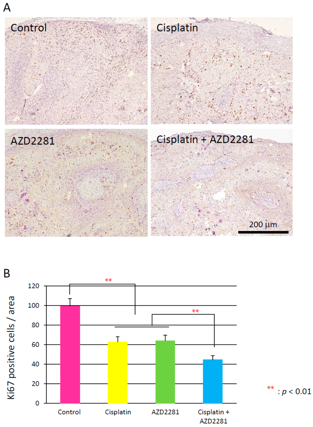 (A) Immunohistochemical analysis of Ki67 in xenografted tumors of control (upper left); cisplatin (upper right); AZD2281 (lower left); and combination (lower right) groups. Scale bar, 200 µm; (B) Ki67-positive cells per area in each treatment group. ** p < 0.01.