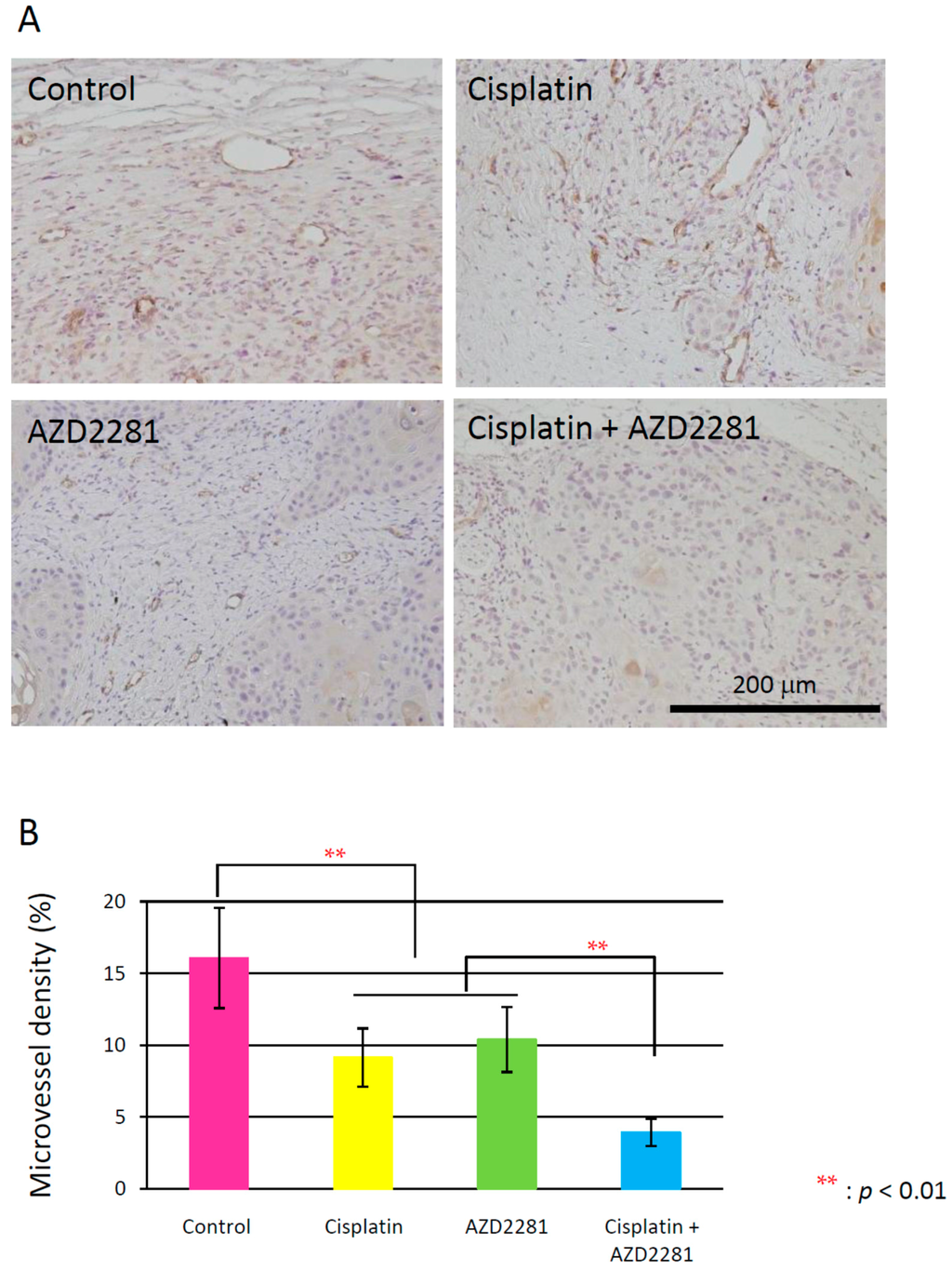 (A) Immunohistochemical analysis of CD31 in xenografted tumors of the control (upper left); cisplatin (upper right); AZD2281 (lower left); and combination (lower right) groups. Scale bar, 200 µm; (B) CD31-positive cells per area in each treatment group. ** p < 0.01.