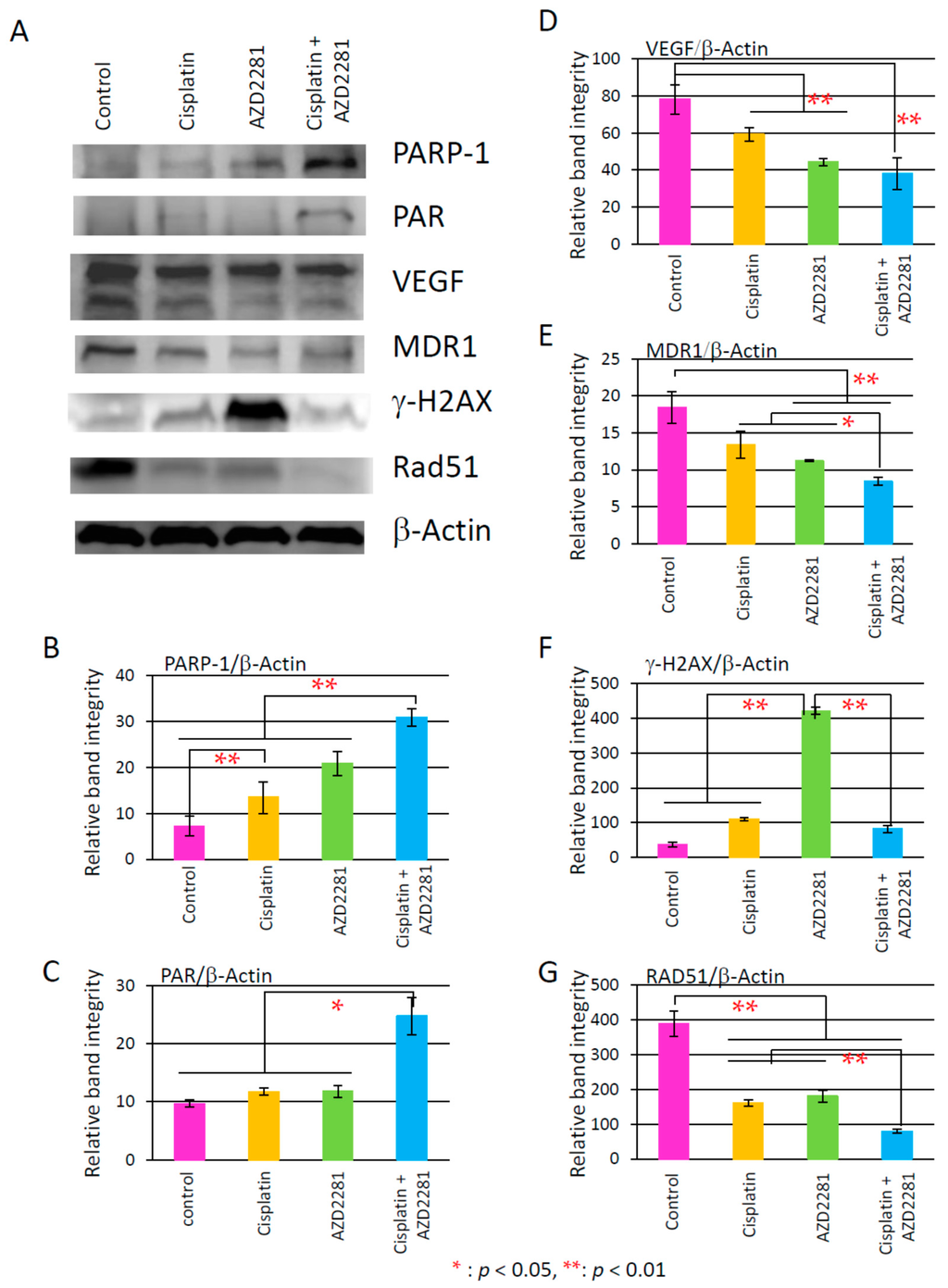 (A) The effect of cisplatin and AZD2281 on the protein expression of xenografted HSC-2 tumors. Relative band intensity of western blot data was normalized by the expression level of β-actin; The proteins analyzed were PARP-1 (poly(ADP-ribose) polymerase-1) (B); poly(ADP-ribose) (PAR) (C); vascular endotherial growth factor (VEGF) (D); multi-drug resistance gene 1 (MDR1) (E); γ-H2AX (F); and RAD51 (G). Values are expressed as the mean ± SEM. * p < 0.05; ** p < 0.01.