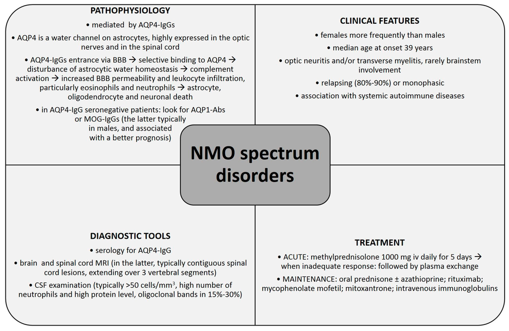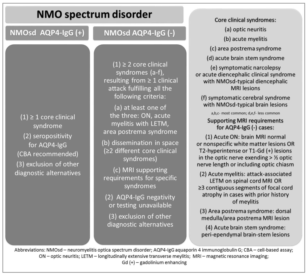 Subsequently, new discoveries in the field of NMO immunopathophysiology as well as some clinical and radiological features, pointed to the conclusion that a broader spectrum of clinical disease exists. The term “neuromyelitis optica spectrum disorders” (NMOsd) includes AQP4-IgG seropositive patients with NMO, but also other limited forms of the disease [2,7].
