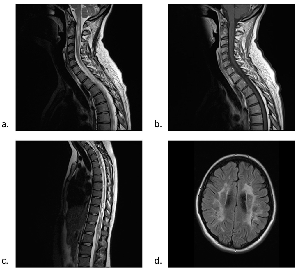 Neuroradiology of neuromyelitis optica spectrum disorder (NMOsd): (a,b) magnetic resonance imaging (MRI) visualisation of cervical spinal cord lesions in a 51-year old female with AQP4-IgG (+) NMOsd; (a) longitudinally extensive, central, extending to brainstem T2-hyperintense lesion; (b) corresponding T1-hypointensities, representing focal spinal cord atrophy; (c,d) thoracic spinal cord and brain MRI lesions in a 20-year old AQP4-IgG (+) female with NMOsd; (c) nearly complete central longitudinal thoracic spinal cord NMO involvement; (d) brain lesions on FLAIR (fluid-attenuated inversion recovery) images that do not fulfill multiple sclerosis diagnostic criteria. Images from the collection of Department of Neurology, Poznan University of Medical Sciences.