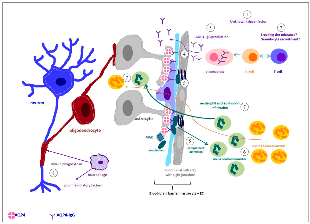 Immunopathogenesis of neuromyelitis optica: (1) primary immunizing event of unknown provenance; (2) T lymphocytes take part in breaking the tolerance and in recruitment of other leukocytes; (3) plasmablasts produce AQP4-IgGs, which enter the central nervous system (CNS) through (4) endothelial transcytosis or at areas of increased blood-brain barrier permeability and then bind selectively to aquaporin-4 (AQP4); (5) complement activation, leading to complement-dependent cytotoxicity and subsequent astrocyte death; (6) neutrophil and eosinophil rise in the periphery and their subsequent CNS infiltration (7) neutrophil and eosinophil infiltration (8) secondary demyelination caused by, among others, myelin phagocytosis, and bystander injury by pro-inflammatory factors. APC: antigen presenting cell; MAC: the membrane attack complex.