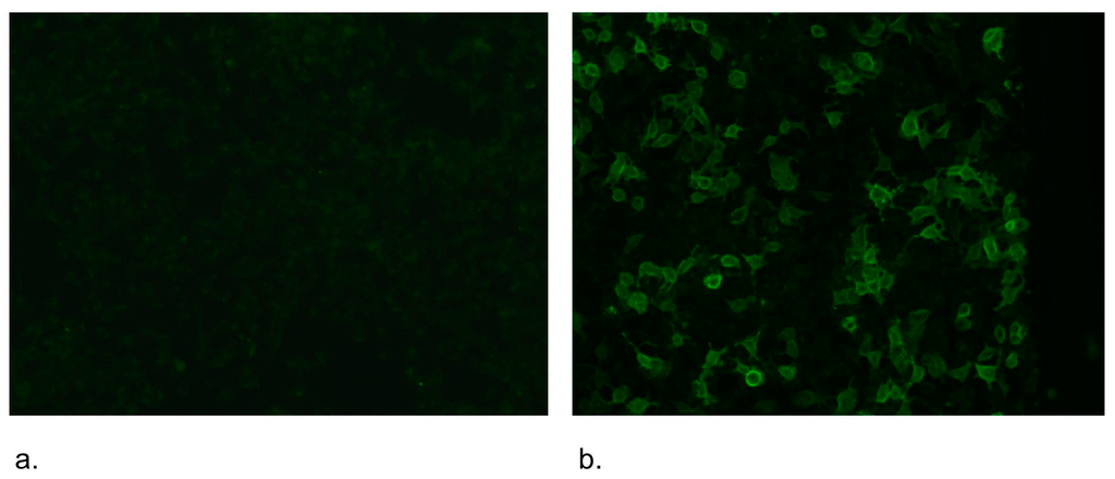 A cell-based assay (CBA) was described for the first time as a proof of AQP-4 detection as a target antigen for NMO-IgG [6,25]. Subsequently, this method was adapted for routine use [25,29,49] (see Figure 4). This CBA has an estimated 91% sensitivity and 100% specificity [25,29].