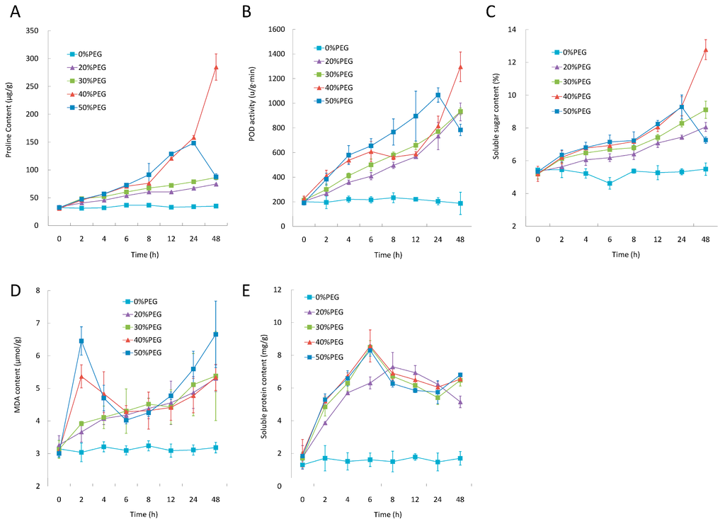 Interestingly, proline content, POD activity, and soluble sugar content consistently showed strict gradient changes: steady linear increases in contents and/or activities were observed under both 20% and 30% PEG treatments over time, while there was a sudden and sharp increase under 40% PEG but decrease under 50% PEG treatment, respectively, at the time point from 24 to 48 h (Figure 1A–C). These results suggest that proline content, POD activity, and soluble sugar content were highly correlated with each other in response to PEG treatments and that high concentrations (e.g., 50%) of PEG plus prolonged (e.g., >24 h) treatment destroyed the plant’s ability to adjust its cell osmotic status.