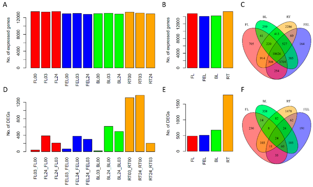 Overall, quite similar numbers of expressed genes were observed in all samples of FL, FEL, BL and RT across three time points (0, 3, 24 h) (Figure 2A). The numbers rose a bit but were still almost equivalent among these four tissues (Figure 2B) when considering the three time points together (which means a gene was counted if it was expressed in at least one out of three time points of the same tissue). Accordingly, most (10,626) of these genes were expressed in all tissues, while only a small amount of genes were exclusively expressed in FL (705), FEL (164), BL (259), and RT (2286) (Figure 2C).
