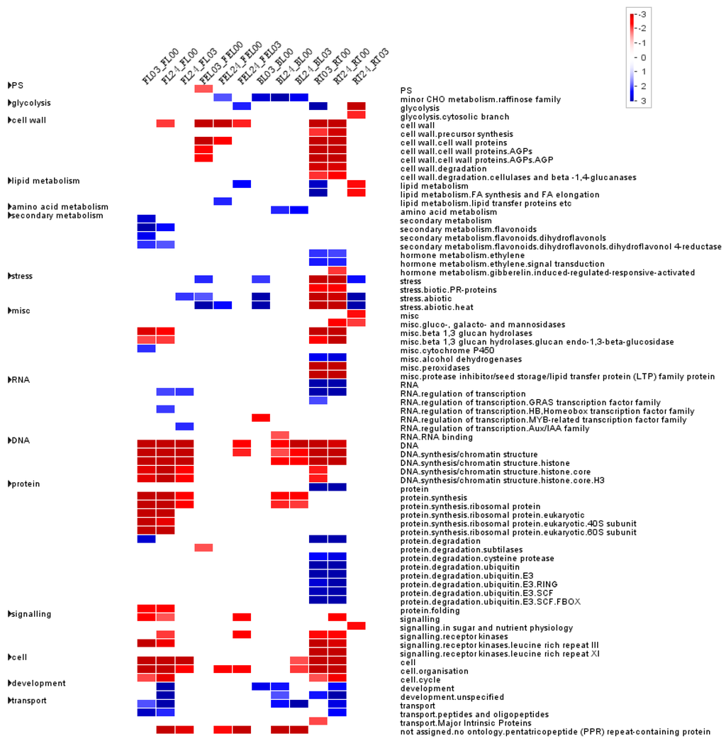 Functional category enrichment of DEGs by pair-wise comparison. Each column represents the DE genes that are dramatically up (blue) or down (red) regulated when comparing two samples indicated at the top, while each row represents a functional category derived from the MapMan software. Enriched functional categories were identified based on Wilcoxon test that embedded in PageMan where ORA cutoff value was set to 1 and p-values were Benjamini-Hochberg corrected.