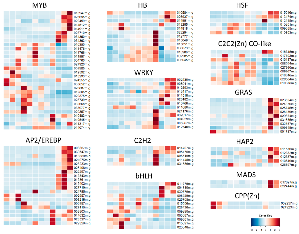In total, 1179 TF genes were expressed in at least one sample of our study, and 170 (14.4%, representing 25 families) of them were differentially expressed in response to PEG treatment (Table S4, Supplementary Material). The four most abundant TF families were MYB (30), AP2/EREBP (20), HB (13), and WRKY (13), followed by bHLH (12), C2C2(Zn) CO-like (9), and GRAS (9, Table S4, Supplementary Material). We inspected the expression level of genes within each TF family, respectively, and different expression patterns were observed. For example, MYB family genes showed multiple diverse expression patterns (Figure 5), indicating that these members had different responses to PEG stress. In comparison, most members of AP2/EREBP, HB, WRKY, and C2H2 were highly expressed either in RT or in BL after 24 h of PEG treatment, bHLH was high expressed in either RT or FL, while HSF was highly expressed in either RT or FEL/BL. The majority of members of C2C2(Zn) CO-like were highly expressed in both FEL and BL, but their expression was greatly decreased at 24 h after PEG treatment. It is worthy to note that most members of GRAS, HAP2 and MADS were highly induced only in RT, while those of CPP(Zn) were exclusively depressed only in FL, in response to PEG treatment (Figure 5).