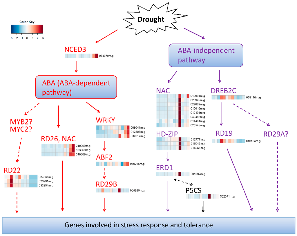 Taken together, these results suggest that besides the common drought-tolerance mechanism in plants, some special and currently unknown ABA-dependent and ABA-independent signal transduction pathways in cassava exist and need to be further explored.